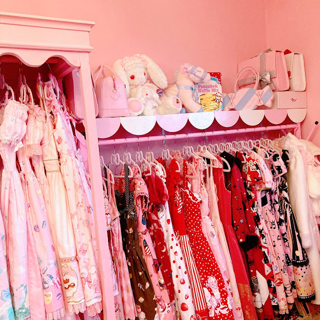 I arranged by bags by theme/color, so I put the pink and sweet bags in this side, and moved the darker bags to the shelf above my black dresses.